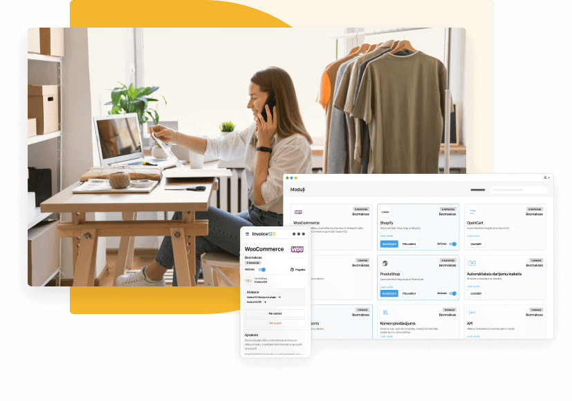 Padari sava e-komercijas uzņēmuma rēķinu izrakstīšanu un grāmatvedību ērti un vienkārši pārvaldāmu ar "Invoice123". Mūsu platformu iespējams saslēgt ar "Shopify" un "WooCommerce". Izmantojot lietojumprogrammu saskarni (API), rēķinu izrakstīšanas procesu iespējams padarīt nemanāmu.